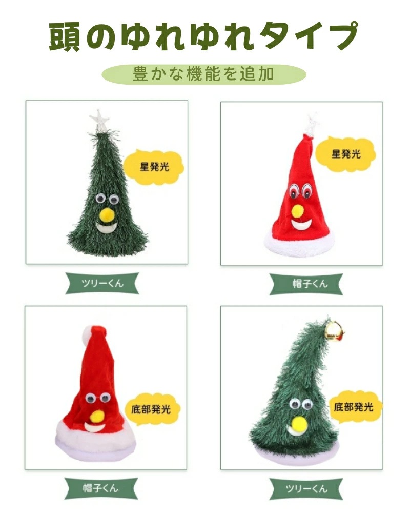 色: ゆれゆれ帽子くん(星発光) ゆれゆれツリーくん(星発光) ゆれゆれ帽子くん(底部発光) ゆれゆれツリーくん(底部発光)