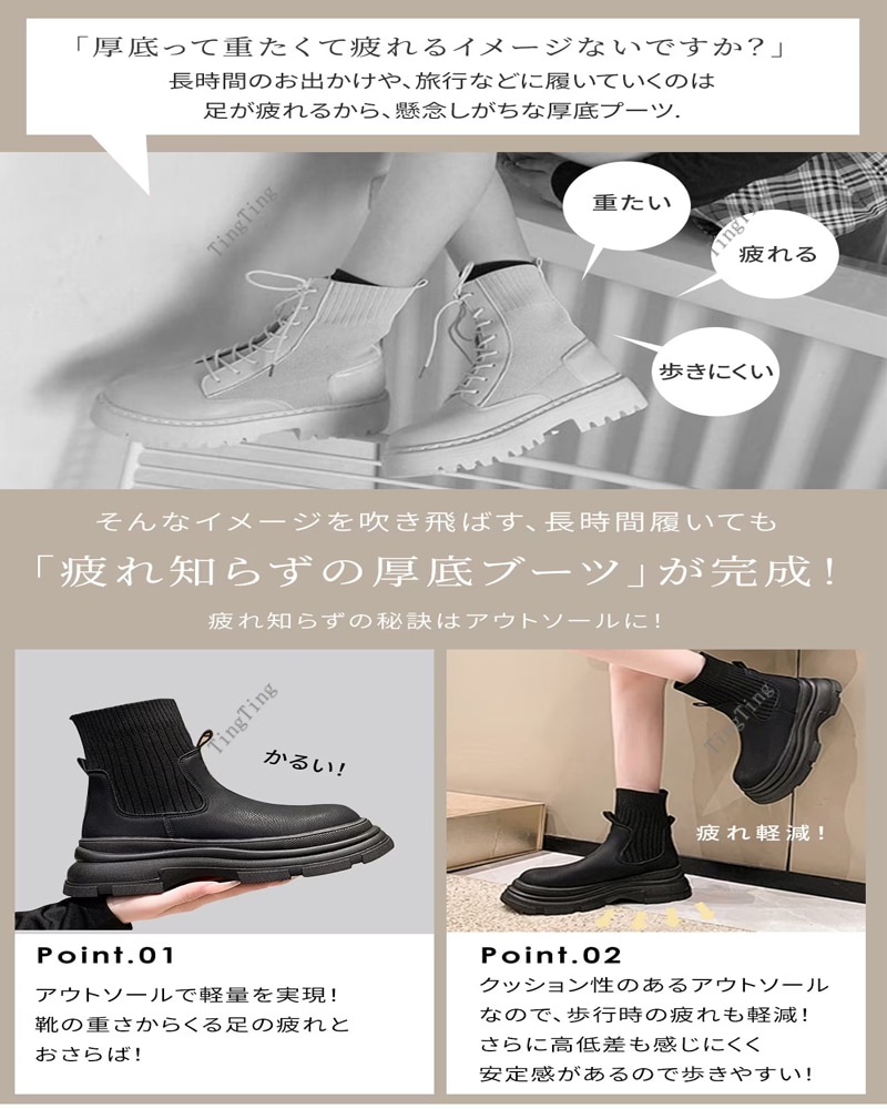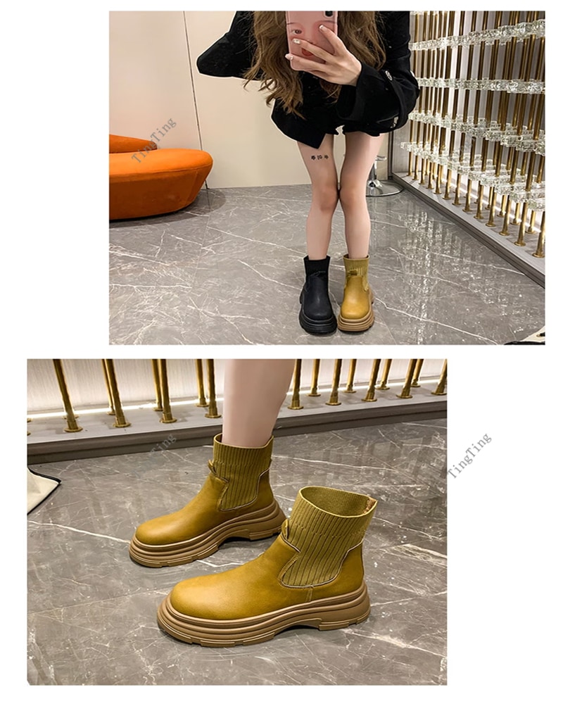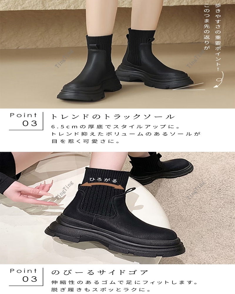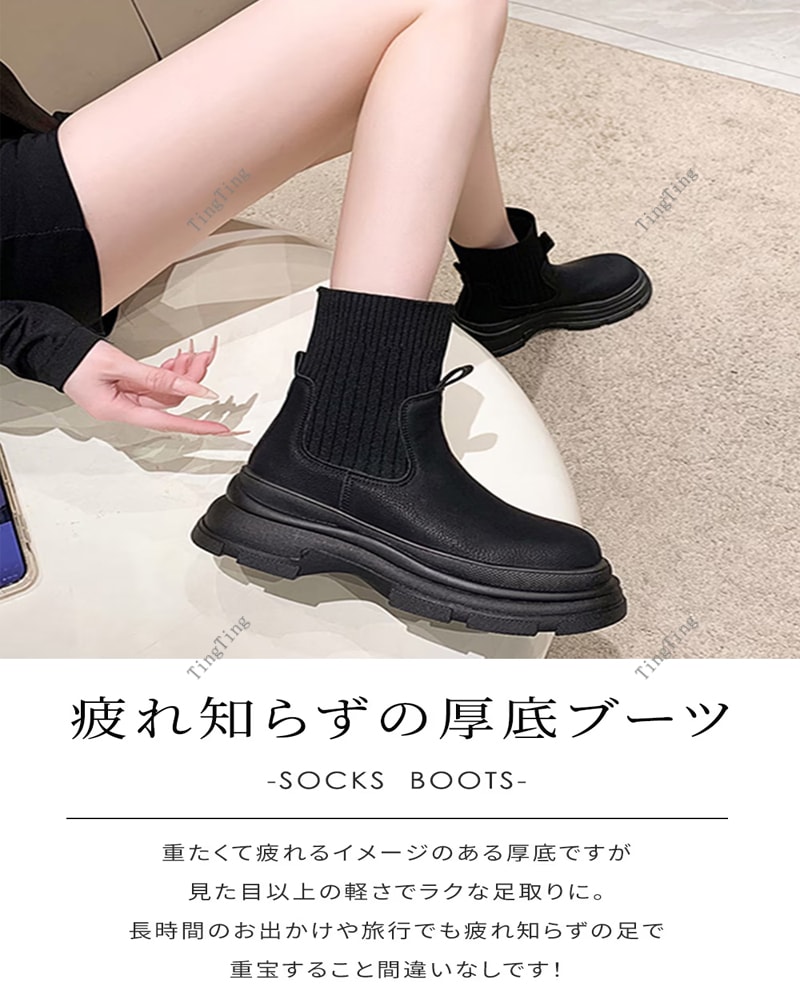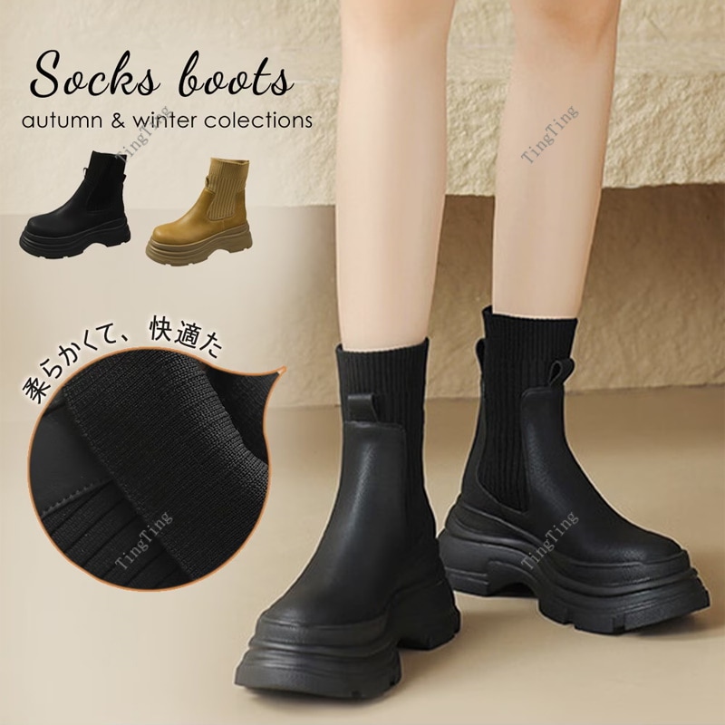 1枚+1枚靴下 ブーツ ミドルブーツ ショートブーツ 厚底ブーツ シューズ 靴 レディース 美脚 バックル ベルト レースアップ 6.5cm台 歩きやすい おしゃれ 韓国風 2color