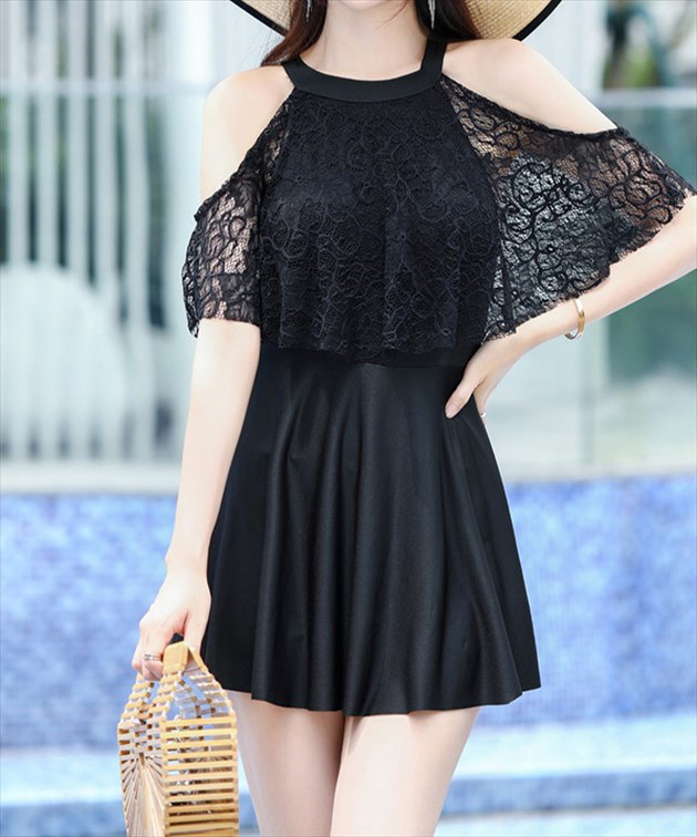 レース レイヤード カットアウト風 スイム ワンピース 女性 レディース 水着 スイムウエア スカート 夏 サマー リボン 海 ビーチ プール リゾート 可愛い キュート フリル アメリカンスリーブ