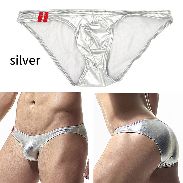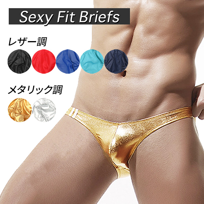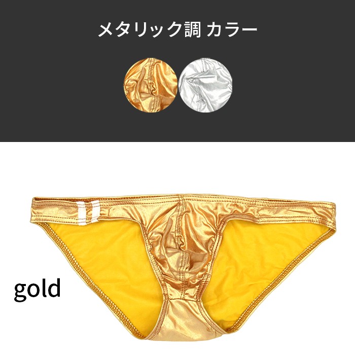 ビキニ ブリーフ メンズ ショーツ セクシー ローライズ フルバック メタリック 光沢 レザー調 派手 かっこいい 透けない ゴージャス ゴールド シルバー e034