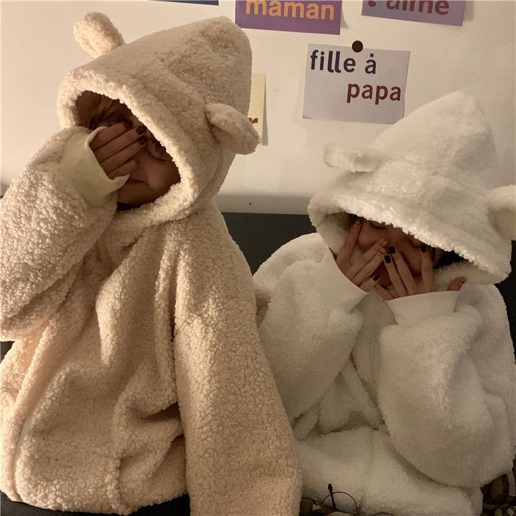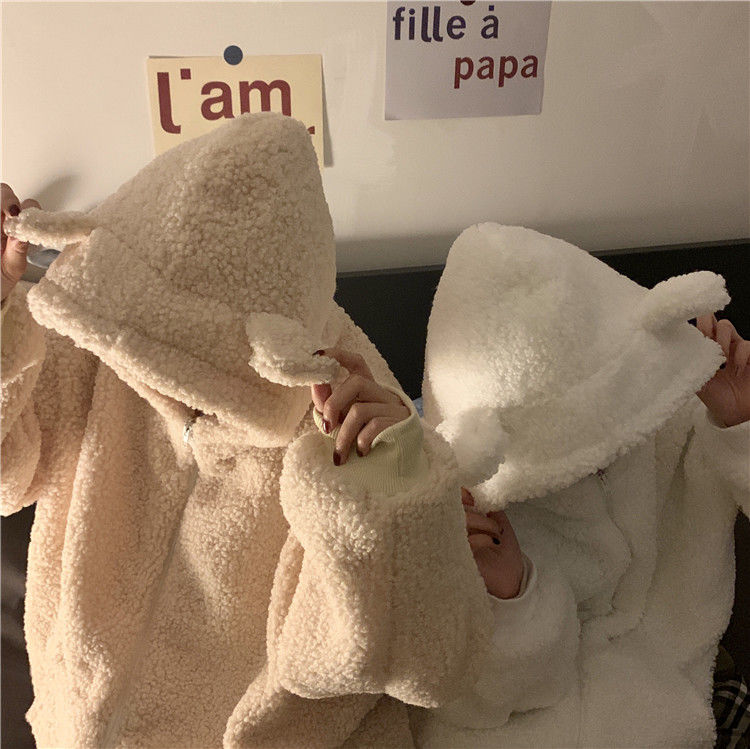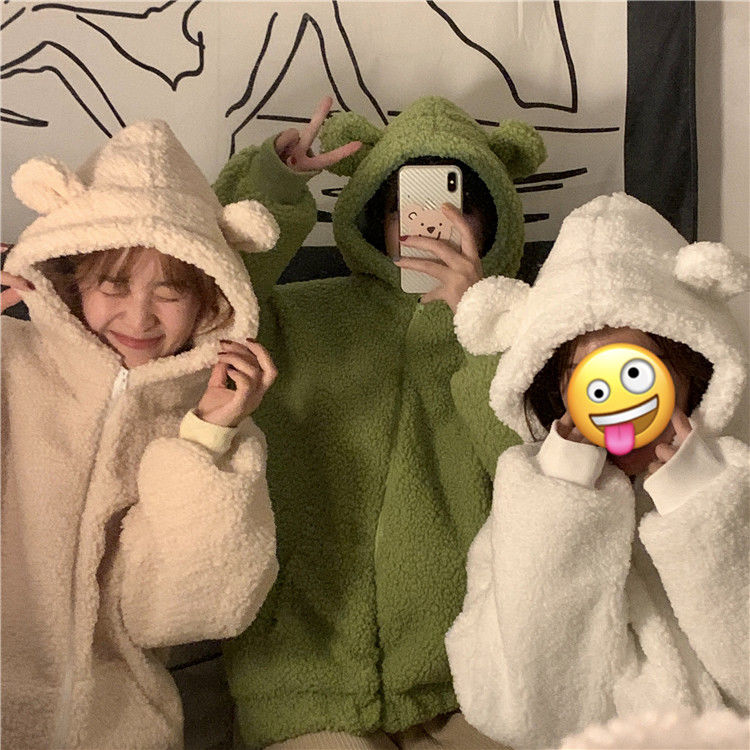 冬のとろみが可愛いくま耳イミテーションラムウール年代縮みジッパー長袖フード付きセータージャケット女子学生 パーカー