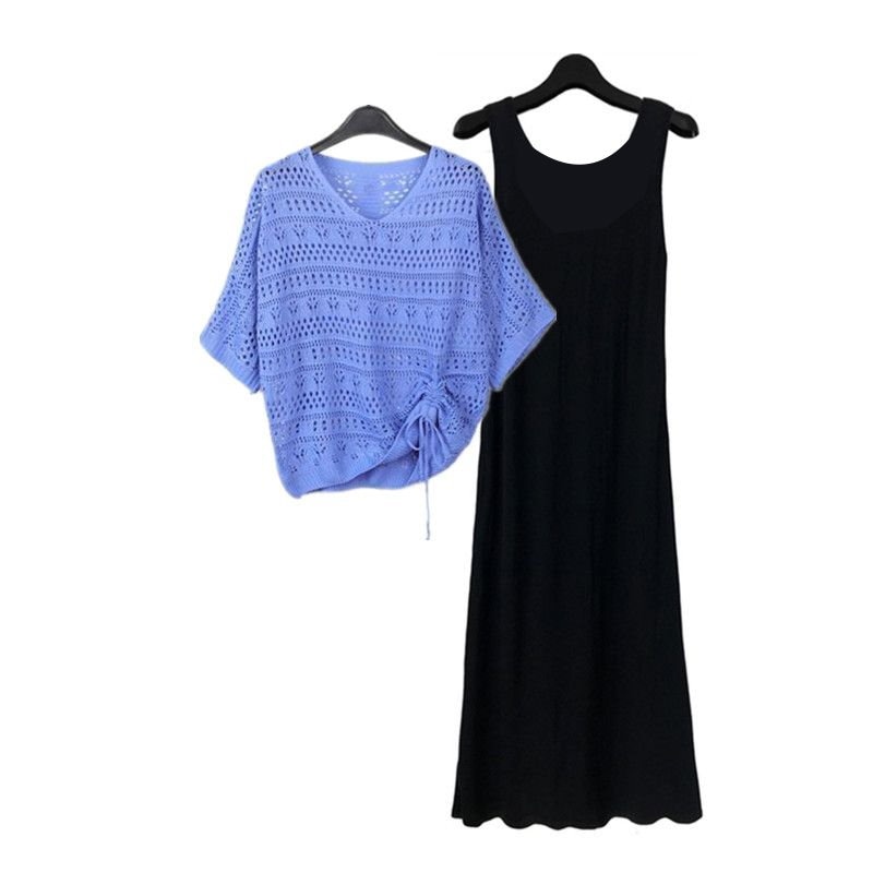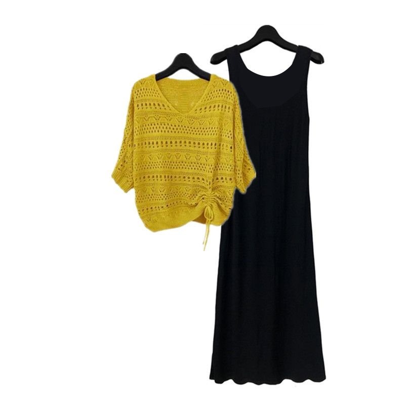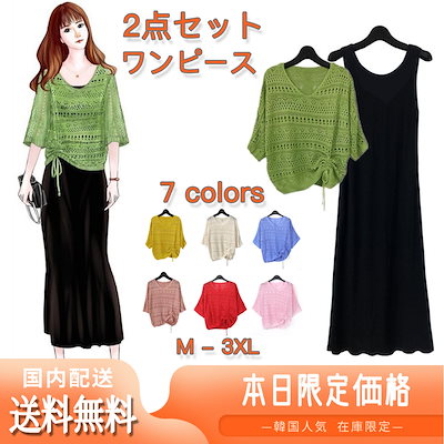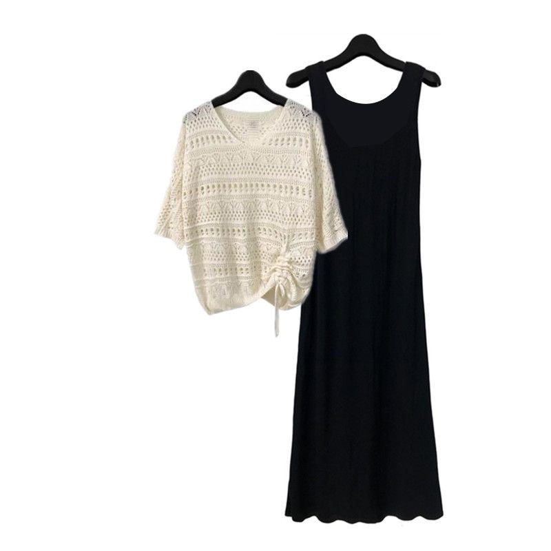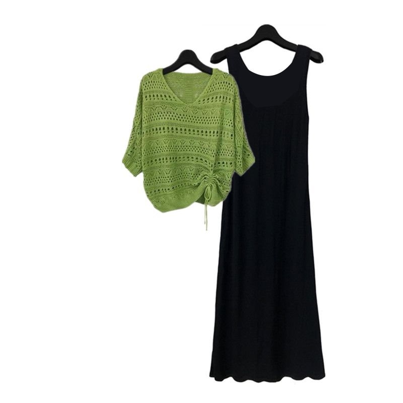 2点セット ワンピース セットアップ レディース コーデセット 黒ワンピース カットアウト ニット カジュアル オシャレ ゆったりめ 気質 女子会