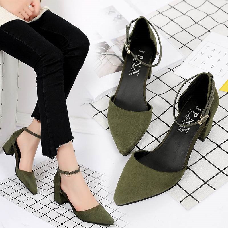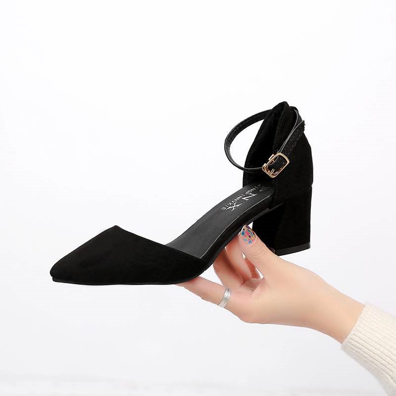 超人気 高評価 春の太ヒールサンダル夏の一文字ボタン付き頭の中と5 cmの単靴の先の中空の黒い職業ハイヒールヒールパンプス韓国ファッション