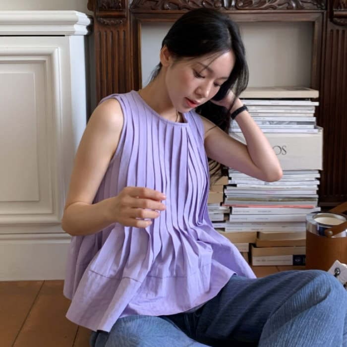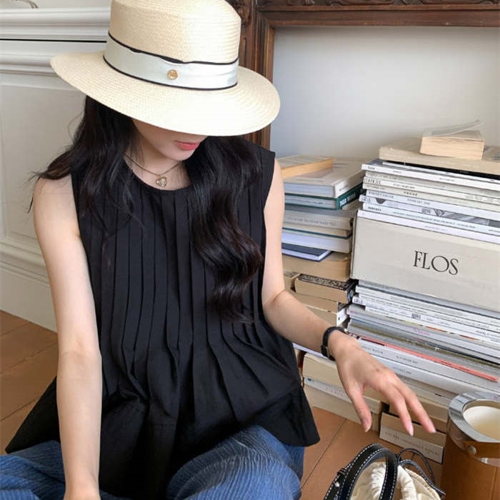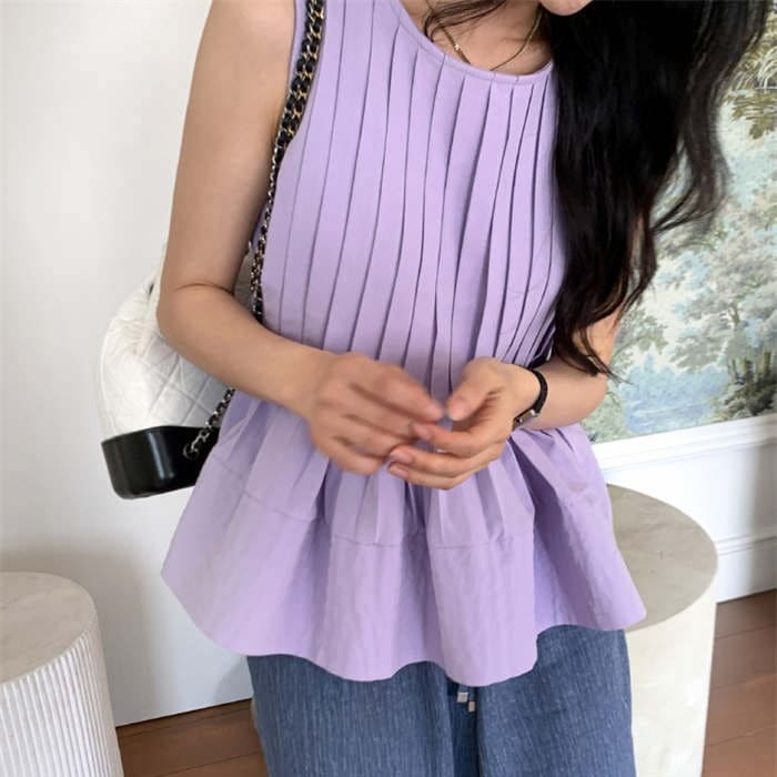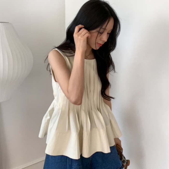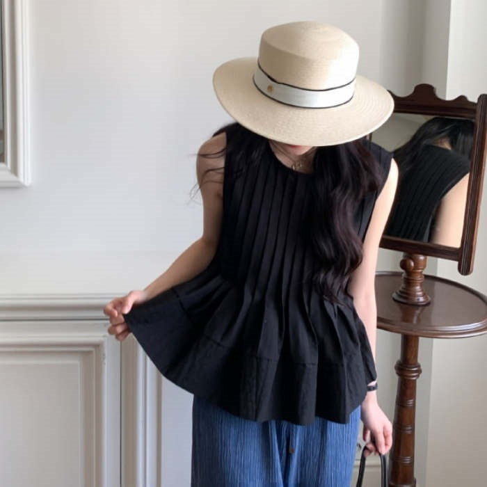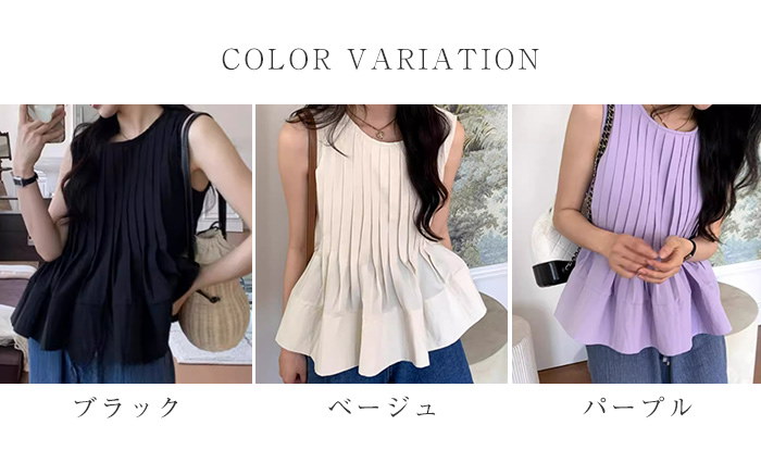 ブラウス トップス シャツ レディース ノースリーブ 春 夏 無地 タンク クルーネック 丸首 大きいサイズ シンプル チュニック プリーツ フリル フレア Aライン ゆったり 体型カバー おしゃれ