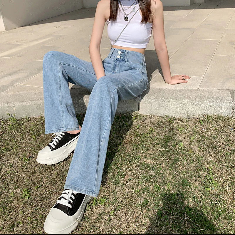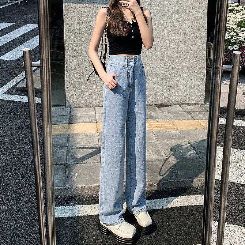 春 夏ハイウエストワイドパンツジーンズ着痩せ垂れ感ゆったりストレートジーンズひんやりボトムス