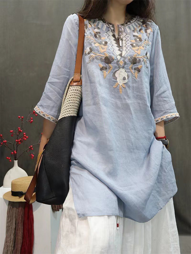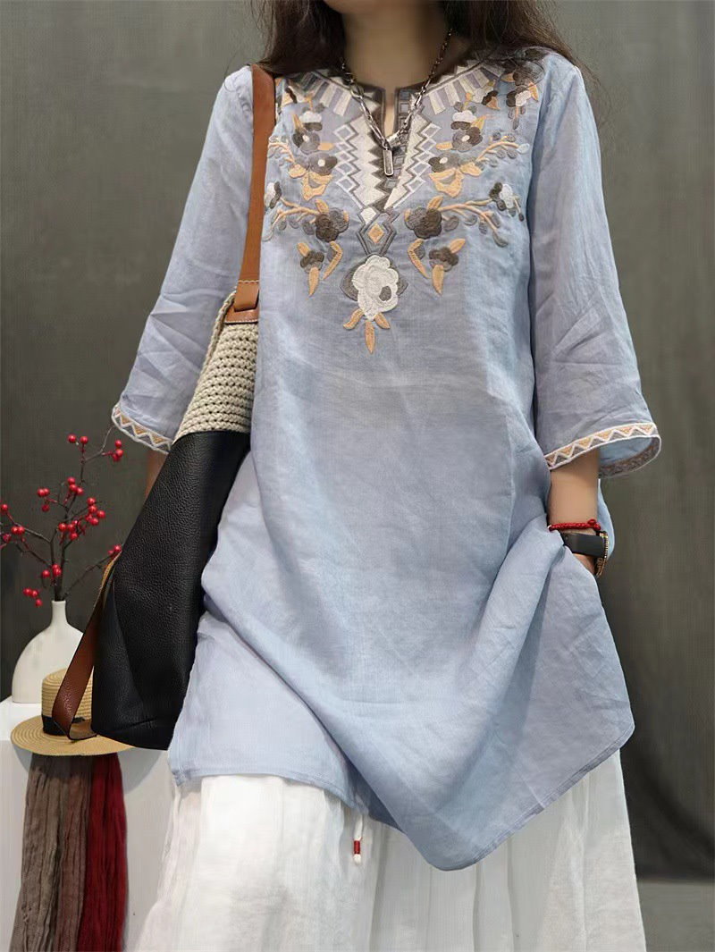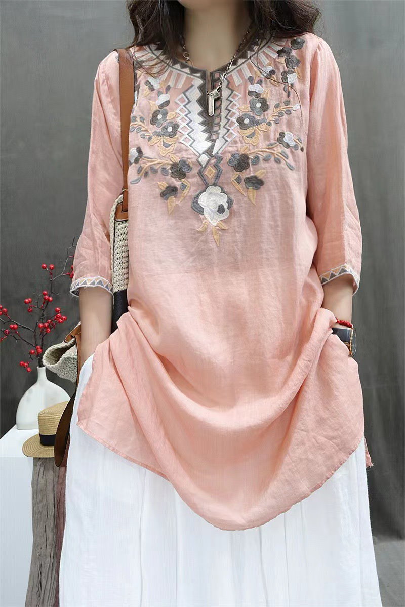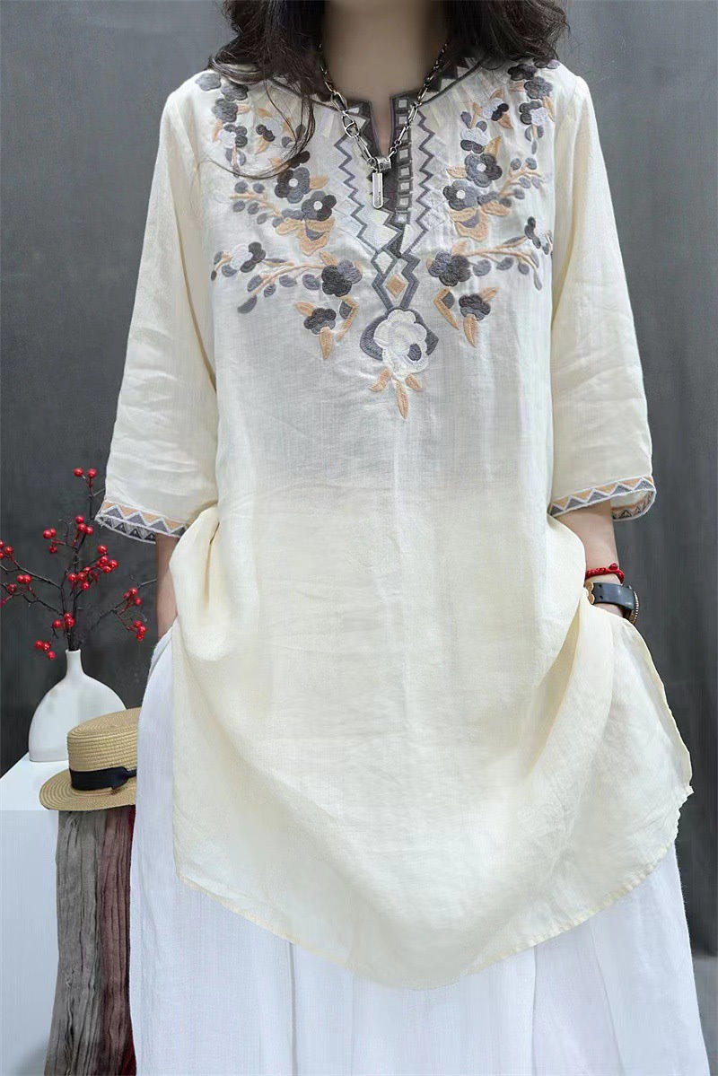 棉麻ブラウス レディース トップス 7分袖 ドルマン レース 刺繍 ドルマントップス 綿 コットン オーバーサイズ 透かし彫り 体型カバー ゆったり