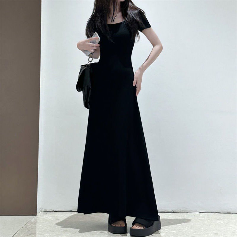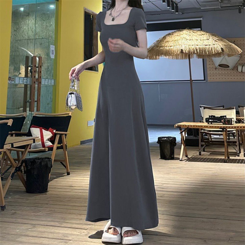 無地で痩せて見えるロングワンピース夏ワンピース痩せ見え半袖雰囲気ロングドレス2024新型フィットフレンチウエスト裾スカート
