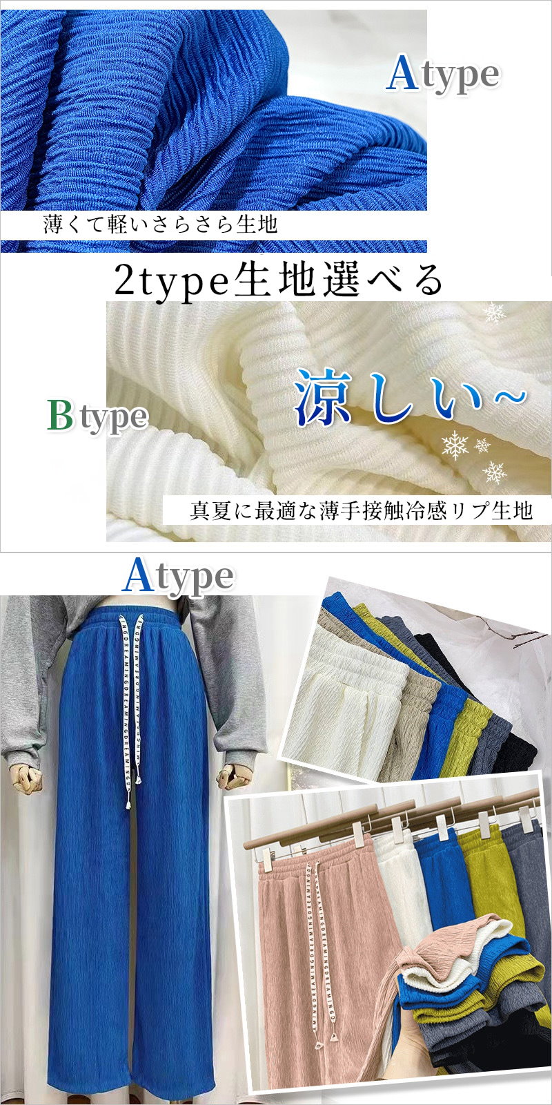 2type 涼感 リブ ワイド パンツ カジュアル ボトムス レディース おしゃれ ガウチョパンツ 薄手 柔らかい 10分 ロング パンツ ルームウェア ウエストゴム 大きいサイズ スラックス 涼しい