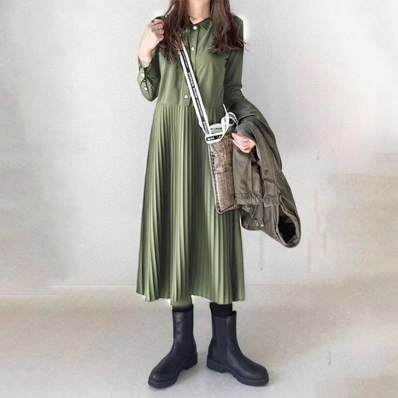 韓国ファッション 秋新作 ワンピース ロングワンピース パーティードレス ド パーティードレスプリーツワンピースシャツワンピース 気品 長袖ワンピース メガ割