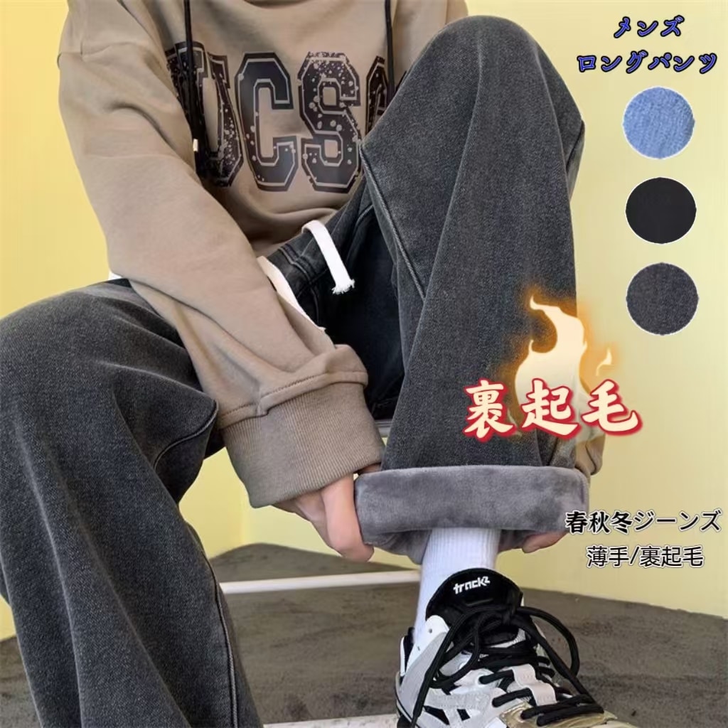 ギャザー厚手ジーンズ男秋冬ゆったりストレートウエストワイドパンツトレンドカジュアルロングパンツ デニム ジーンズ