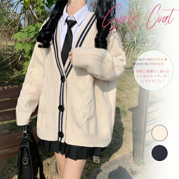 カーディガン スクール ニットカーディガン 学生服 スクールセーター ニット 女子 制服 ニット 無地 ニットカーデ ボタン付き 前開き ライン入り学生 厚手 長袖 配色 Vネック ゆったり トップ