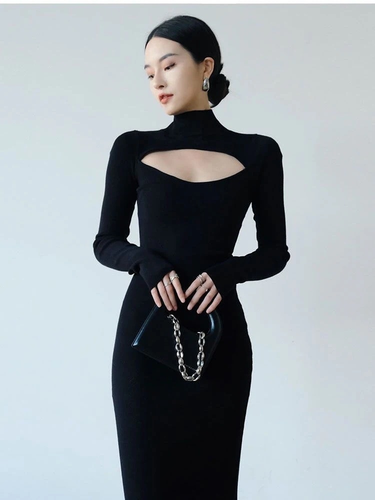 冬のワンピース ハイネック ニッチデザイン 透かし彫り 個性 スリミング 着痩せ 気質 フィッシュ ニットワンピ