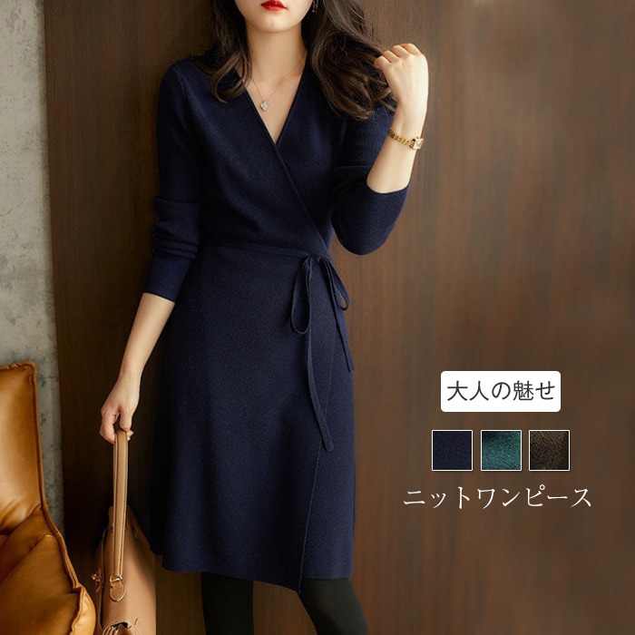 ニットワンピース レディース 春 秋 Vネック 膝丈 ワンピース ニット チュニック ミディアム丈 長袖 Aライン ゆったり シンプル カジュアル 体型カバー 柔らか 暖か 女性らしい きれいめ お洒