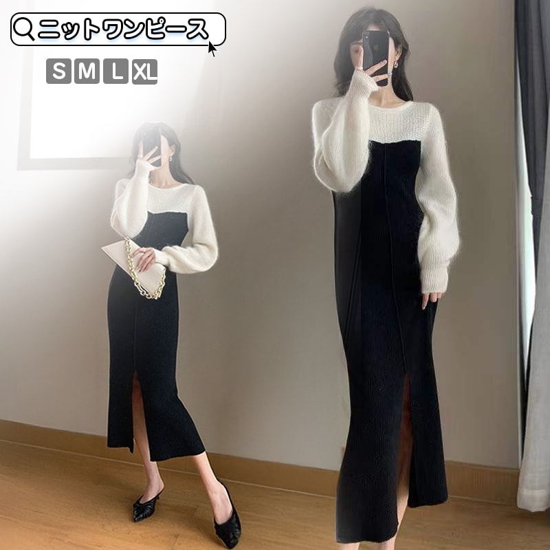 ブラック ニットワンピース 秋冬新作 気品ある セーター ドレス おしゃれなロングワンピース 韓国スタイル インナーにもぴったり オフィス デイリー使用に最適