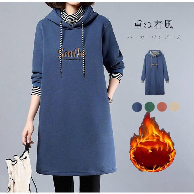 ロングパーカー 重ね着風 ワンピース チュニック 長袖 裏起毛 膝丈 レディース おしゃれ ロゴ スウェット フード付き パーカー