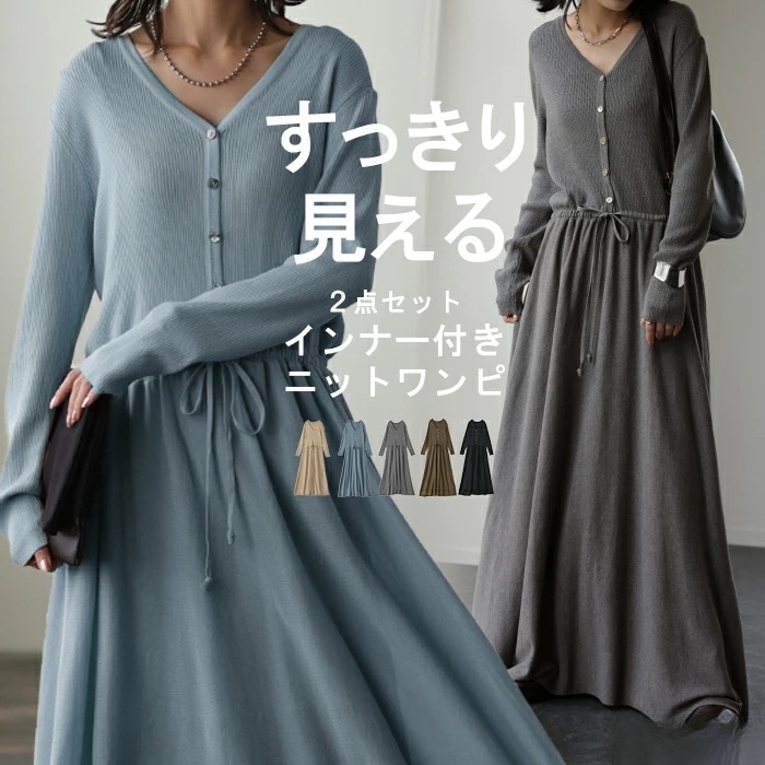Q-CQ-07秋冬新Vネックスリム長袖ニットワンピースワンピースフェイクツーピースワンピーススタイル ニットワンピ