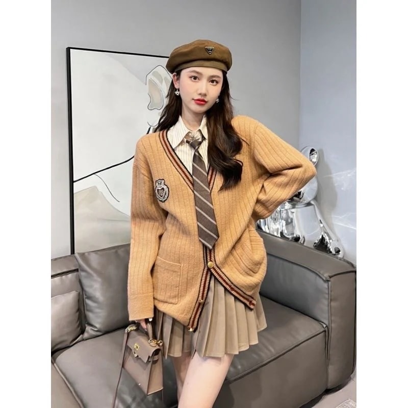 カーディガン3点セット 上下セットシャツリボンバッジニットカーディガン長袖卒業式プリーツスーツジャケット婦人セーター無地Vネック秋冬 セットアップ