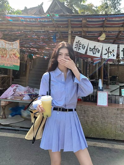 涼しく楽ちんセットアップ 2024春夏の新作高級長袖エアリーシャツ+スカートストライプスーツ レディース 韓国ファッション セットアップ