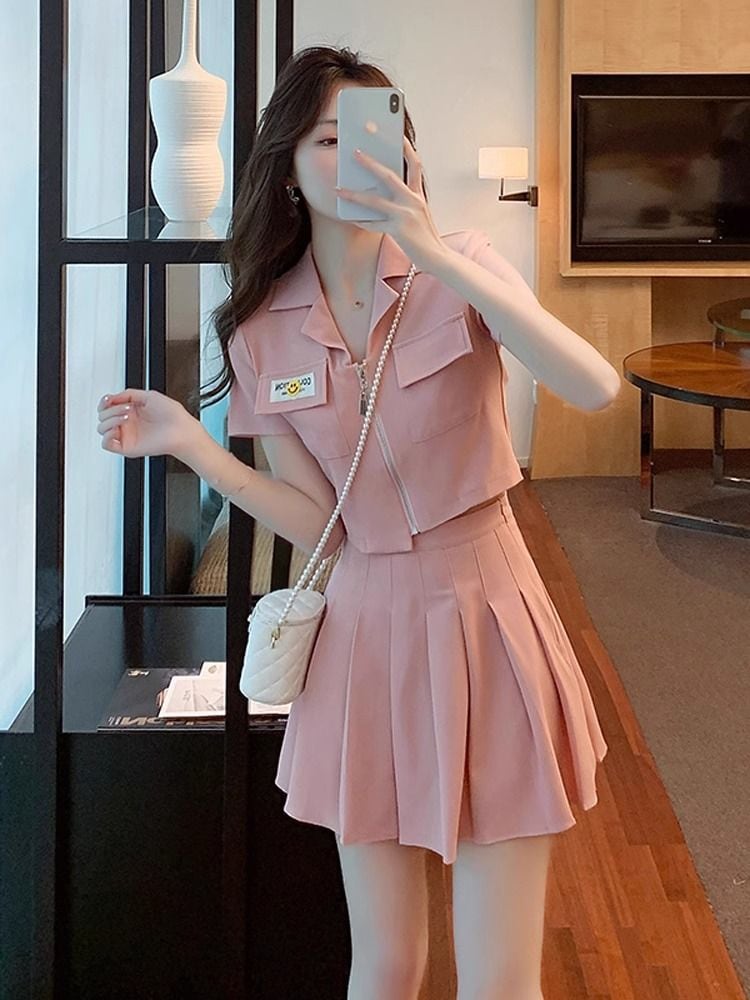涼しく楽ちんセットアップ ファッション 2つのセット 2024夏モデル 薄手の金 半袖トップス+プリーツスカート セット レディース 韓国 セットアップ