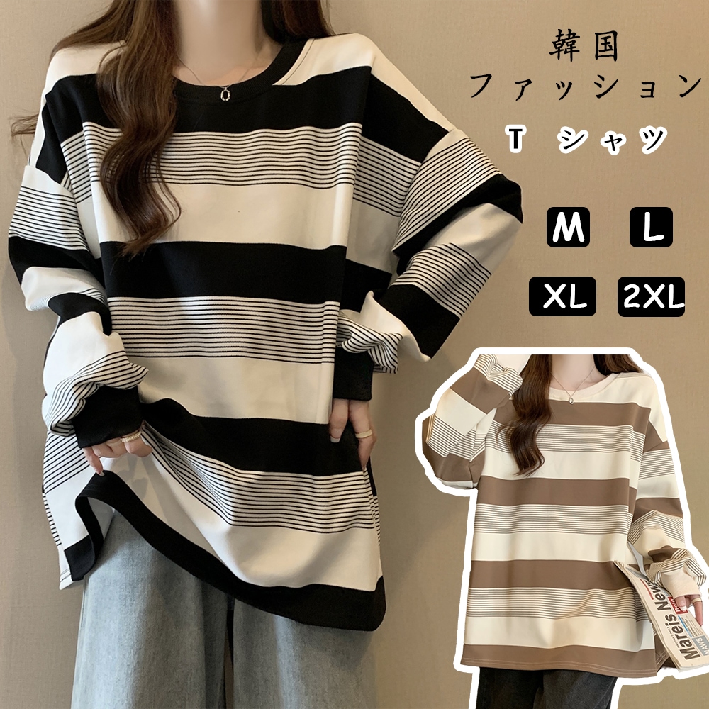 韓国ファッション 秋コーデ オーバー サイズ パーカー 長袖 レディース トップス ストライプ Tシャツ ロンt 韓国 長袖tシャツレディース ロングT