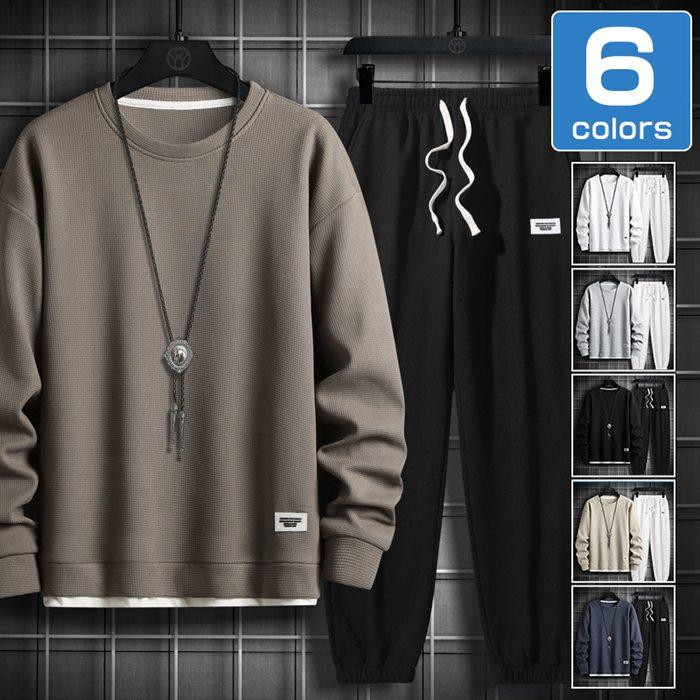 上下セット 長袖 メンズ トレーナー 重ね着風 スウェット ウエストゴム ロング丈 ワッフル編み クルーネック ジョガーパンツ セットアップ