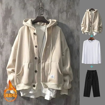 秋冬 メンズ カジュアル 裹起毛 パーカーコート+長袖Tシャツ+スウェットパンツ 上下3点セット ジャージ 大きいサイズセットアップ