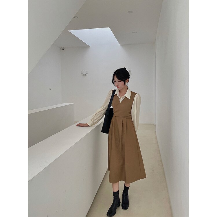 】秋 冬 切り替え プリーツ 高級感 シャツワンピース 長袖 おしゃれ ゆったり 着痩せ ドレス パーティードレス 韓国 ワンピース秋冬