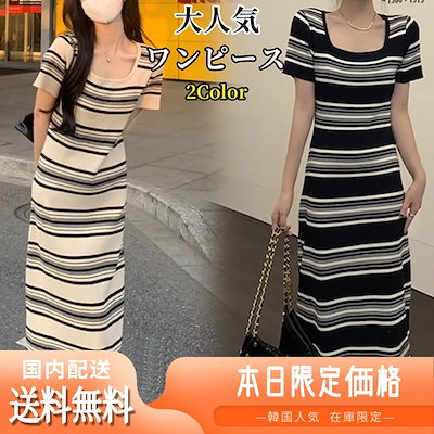 春 夏ワンピース ショートスリーブのストライプのスクエアネックニットワンピースフレンチスタイルの雰囲気漂うAラインロングスカートとスタイリッシ