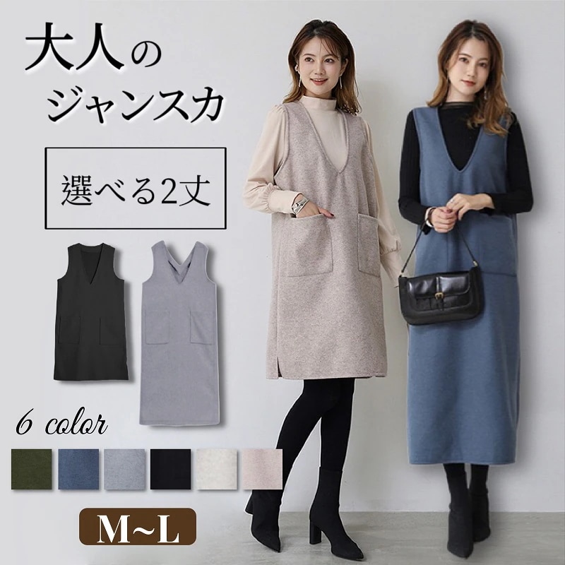 大人のジャンパースカート 選べる長さ ロング丈 ミディアム丈 スキッパー ジャンスカ ノースリブ 深Vネック ロングワンピース Vネック スリット入り ウール 無地 レイヤード カジュアル オフィス