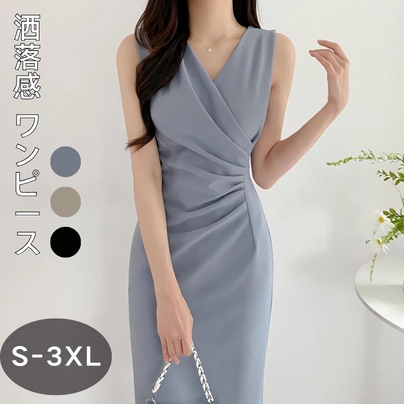 レディースファッション ノースリーブ Vネック ワンピース ドレープ感 膝丈 ベストドレス スリット付き ロングドレス レディース用 袖なしミニ 膝丈ワンピ
