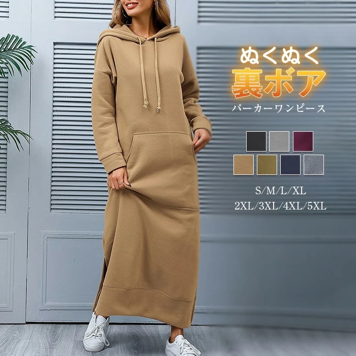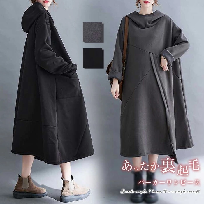 ワンピース 裏起毛 レディース 秋 冬 パーカーワンピース ワンピース ロング丈 プルオーバー ワンピース 大きいサイズ 体型カバー ゆったり ビックシルエット 長袖 裏ボア 裏起毛 無地 防寒 ゆ