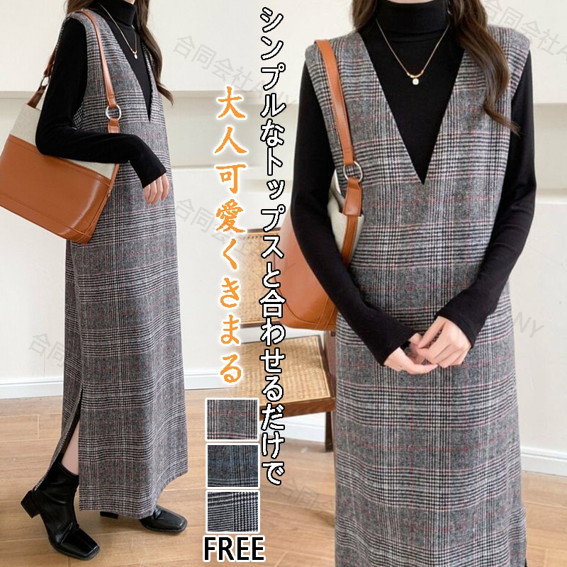 ジャンパースカート 秋 冬 ジャンスカ ワンピース Vネック 無袖 ベストワンピース 膝下 レディース ロング丈ジャンパースカート 秋 冬 シンプル カジュアル プリーツ レイヤード きれいめ お洒落
