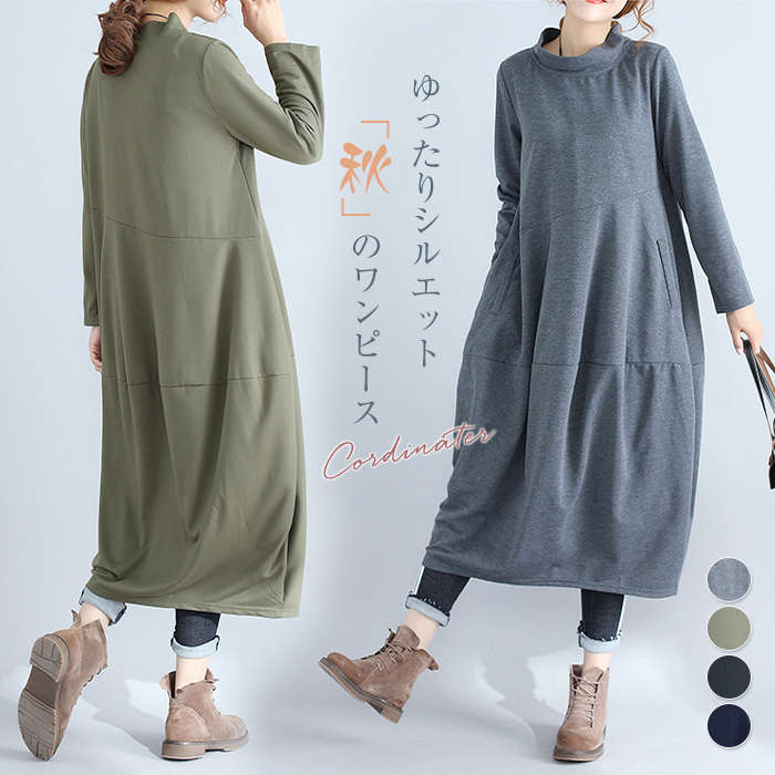 ワンピース 秋 長袖 レディース きれいめ 秋冬 秋物 ロングワンピース ロング丈 ワンピ大きいサイズ 体型カバー ハイネック ギャーザー ゆったり カジュアル 大人 可愛い着痩せ 着瘦せ Aライン