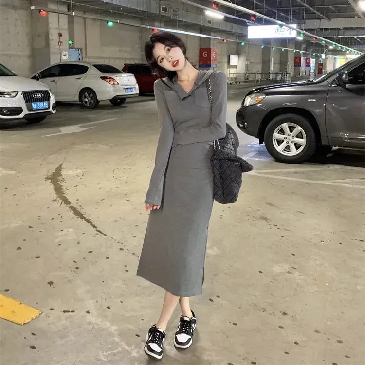 スリムフード付き長袖ワンピースレディーススキニースプリットパッケージヒップインサイドボトムロングスカート 長袖ロング マキシ丈ワンピ