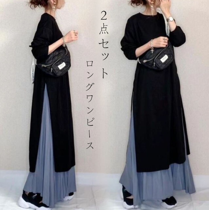 2024初秋長袖ロングマキシ丈ワンピ2点春 秋の新ロングロングスリーブオープンステッチロングルーススキニードレス ワンピ ロング夕イトスカ一ト冬のワンピース