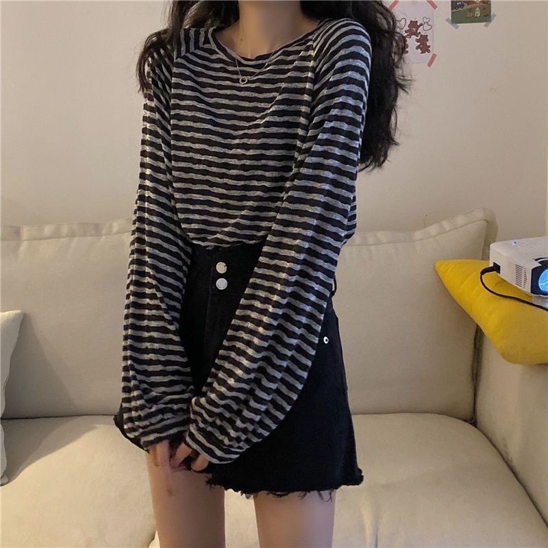Tシャツ初秋の野生の縞模様の長袖トップスTシャツ女性の学生の緩い原宿怠惰な秋服ボトムシャツの韓国語バージョンロンT Tシャツ カットソー