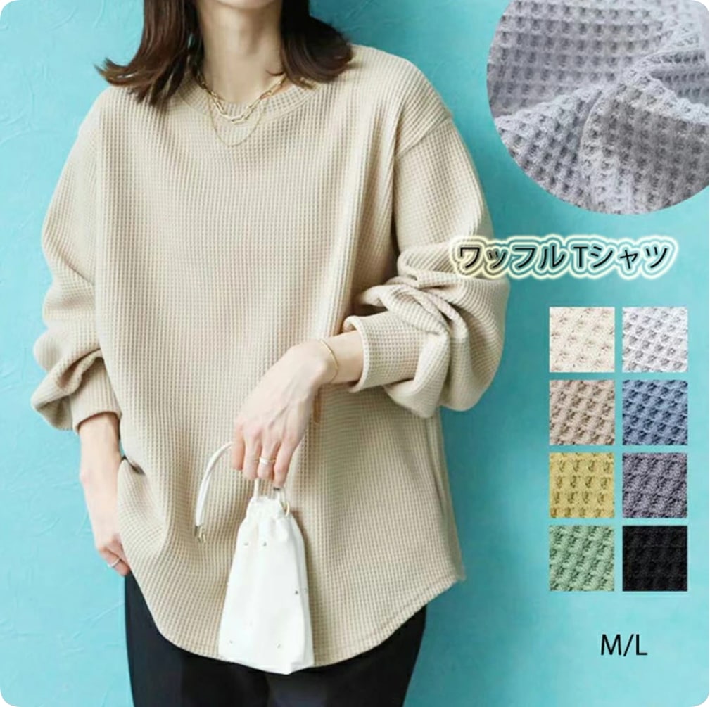 ワッフル ニット プルオーバー レディース サーマル カットソー ワッフル ロンT トップス 無地 長袖 Tシャツ ロング ロングTシャツ チュニック きれいめ 丸首 お洒落