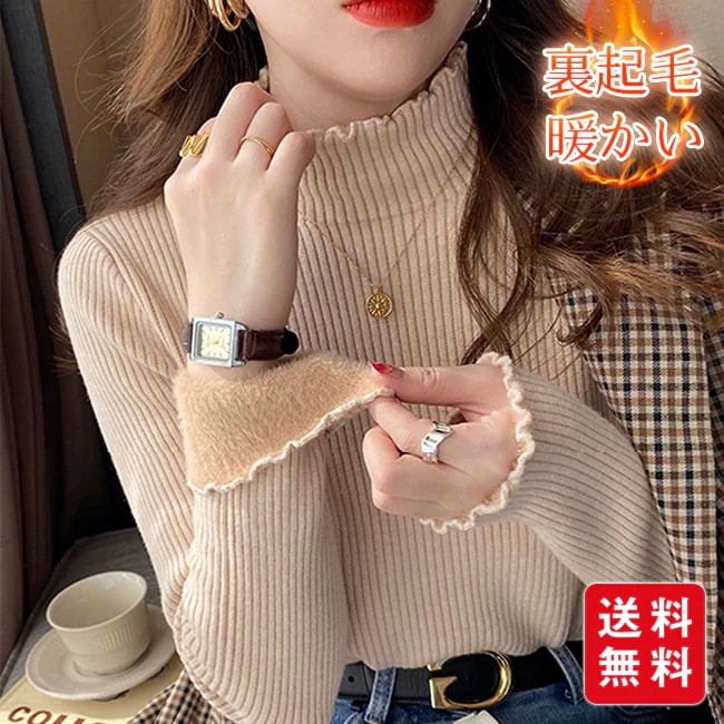 裏起毛 ニット トップス レディース フリルネック ミドルネック セーター モックネック 裏ボア 秋冬 長袖 オフィス カジュアル 暖か 防寒