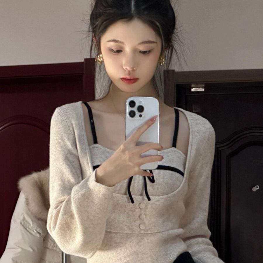 純欲風デザイン感リボンキャミソールニット2点セット女春の新作小柄インナートップス秋冬インナー Tシャツ カットソー