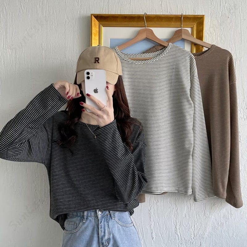 ニットタッチ万能ボーダーカットソー Tシャツトレーナースウェットトップス ストレッチドロップショルダー韓国ファッション Tシャツ カットソー