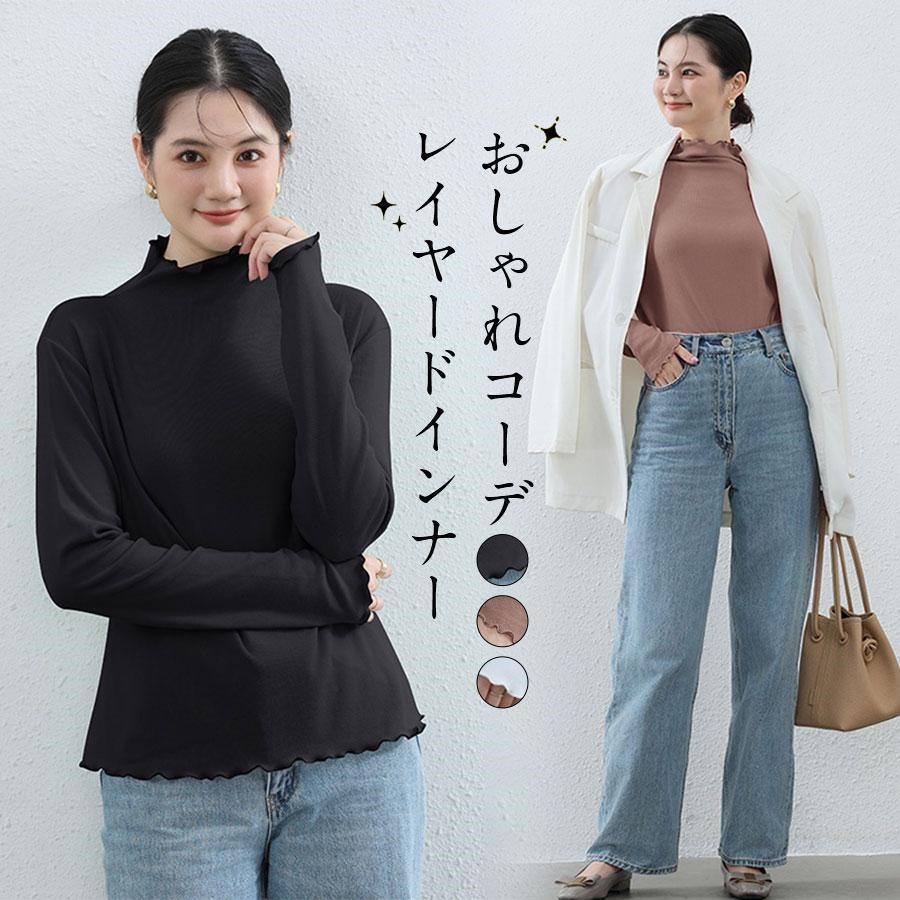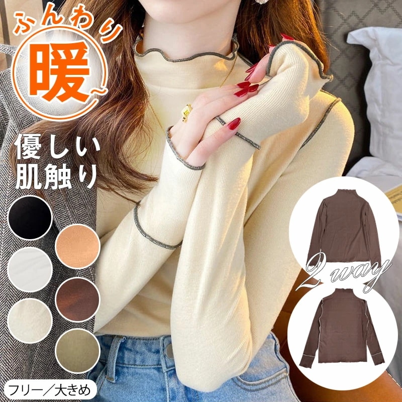 長袖 tシャツ カットソー両面着用インナー レディース トップス 秋 冬 タートルネック シンプル カジュアル 無地 重ね着 あったか 厚手 保温 フリル 女性ファッション 通勤 日常