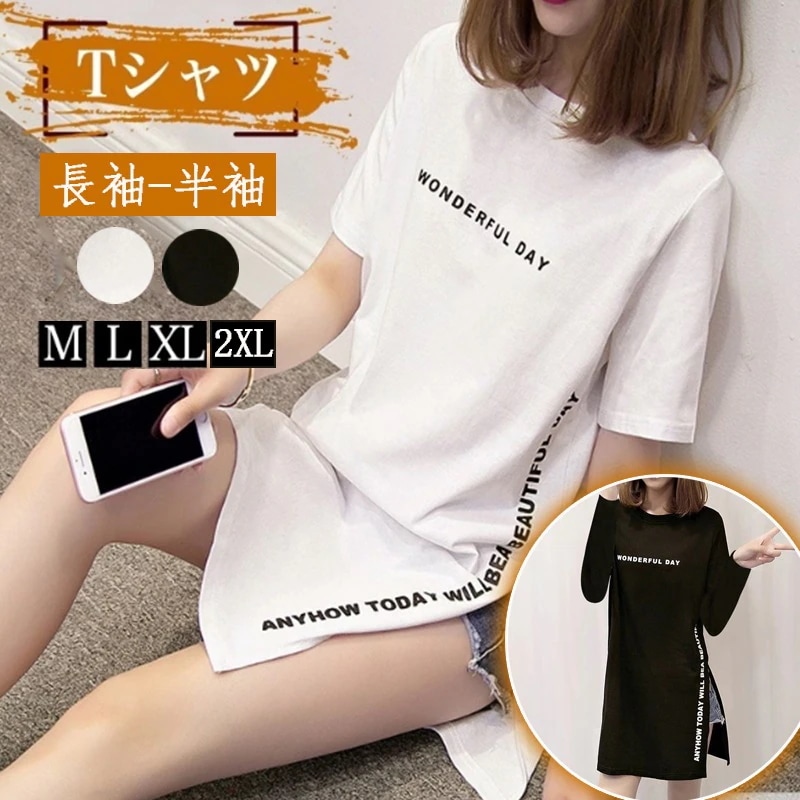 スウェットプリント英字スリット入りロングTシャツカットソー冷感シャツ レディース フレンチスリーブ クルーネック Tシャツ トップス カットソー 半袖 夏服 ラウンドヘム