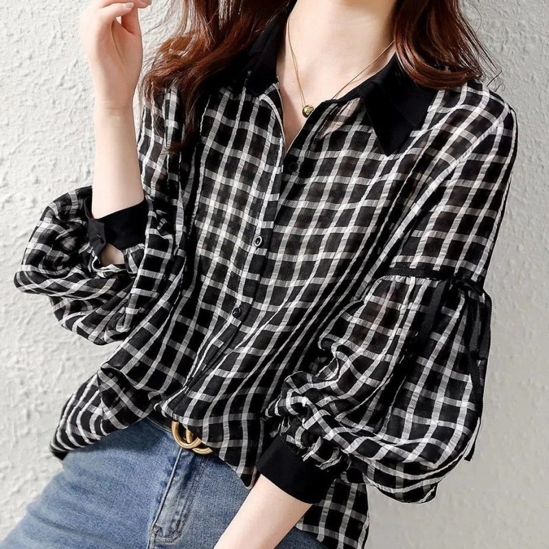 2024人気の新作tシャツ 長袖ブラウス 秋 シャツ 薄 シアーシャツ ランタン袖 シフォンブラウス レディース トップス チェック花柄 百掛け 韓国ファッション 春 長袖 通勤