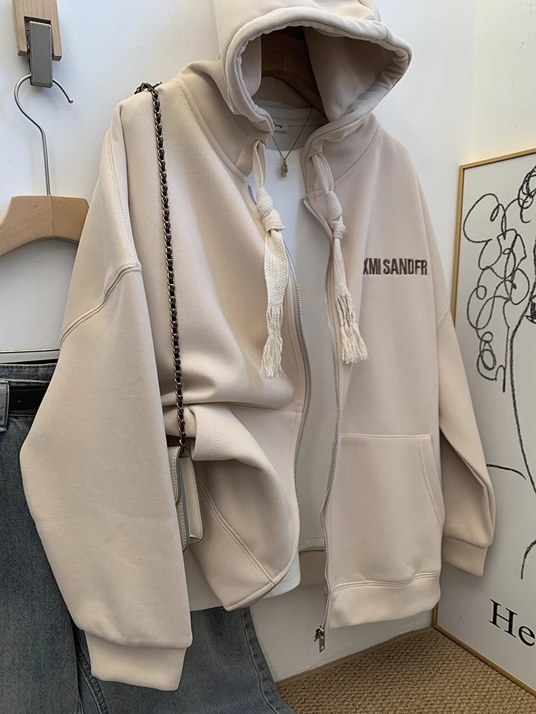 カーキのアメリカンレトロカーディガンファスナーハットパーカーレディース春秋のゆったり気だるい風アウターブーム Tシャツ カットソー