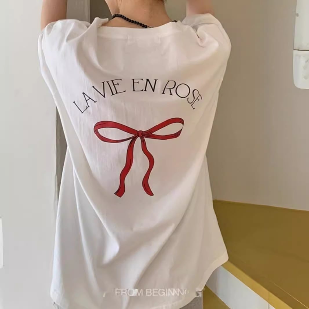 Tシャツ レディース 韓国バックリボンプリントルーズ半袖tシャツ Tシャツ カットソー