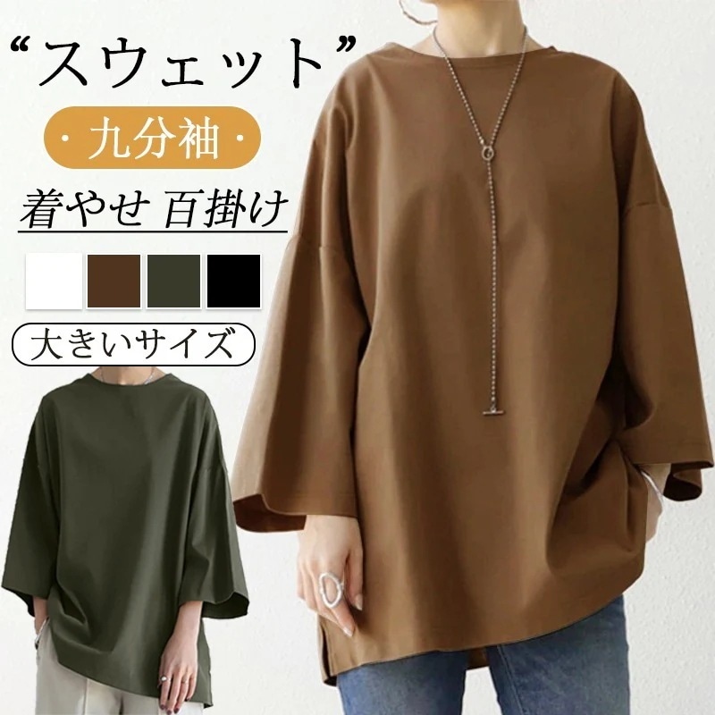 Tシャツカットソー シフォンブラウス 4color 新作 初春 長袖 スウエット ラウンドネック レディース ゆったり 九分袖 チュニック フレアスリーブ Tシャツ ロングTシャツ トップス 無地