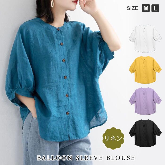 ブラウス レディース 春夏 黒 白 シャツ リネン バルーンスリーブ ブラック カジュアル ホワイト イエロー パープル ブルー 20代 30代 40代