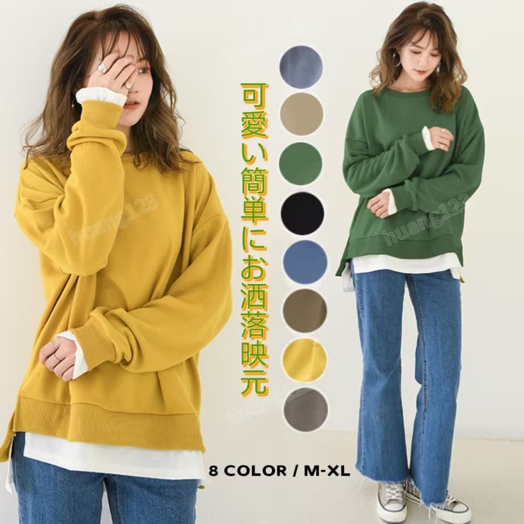 2025 新作 高品.質 シンプル スウエット T 百掛け フェイクレイヤード 運動 トップス アウター ロング 大きめサイズ パーカー 着痩せ 長袖 Tシャツ