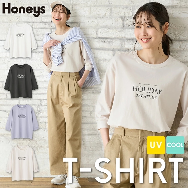 Honeys きれいめ7分袖ロゴT トップス カットソー ロゴTシャツ Tシャツ 7分袖Tシャツ ハニさら Tシャツ カットソー