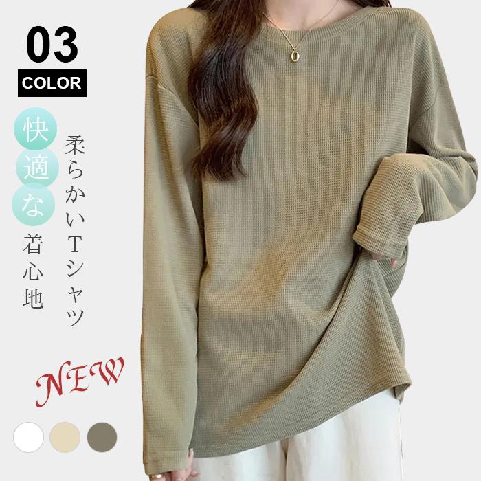Tシャツ レディース トップス ワッフルTシャツ 長袖 クルーネック 薄手 春夏 無地 カジュアル シンプル おしゃれ 通学 女子 大人 Tシャツ カットソー